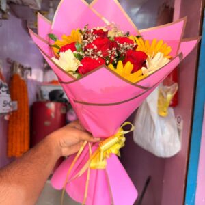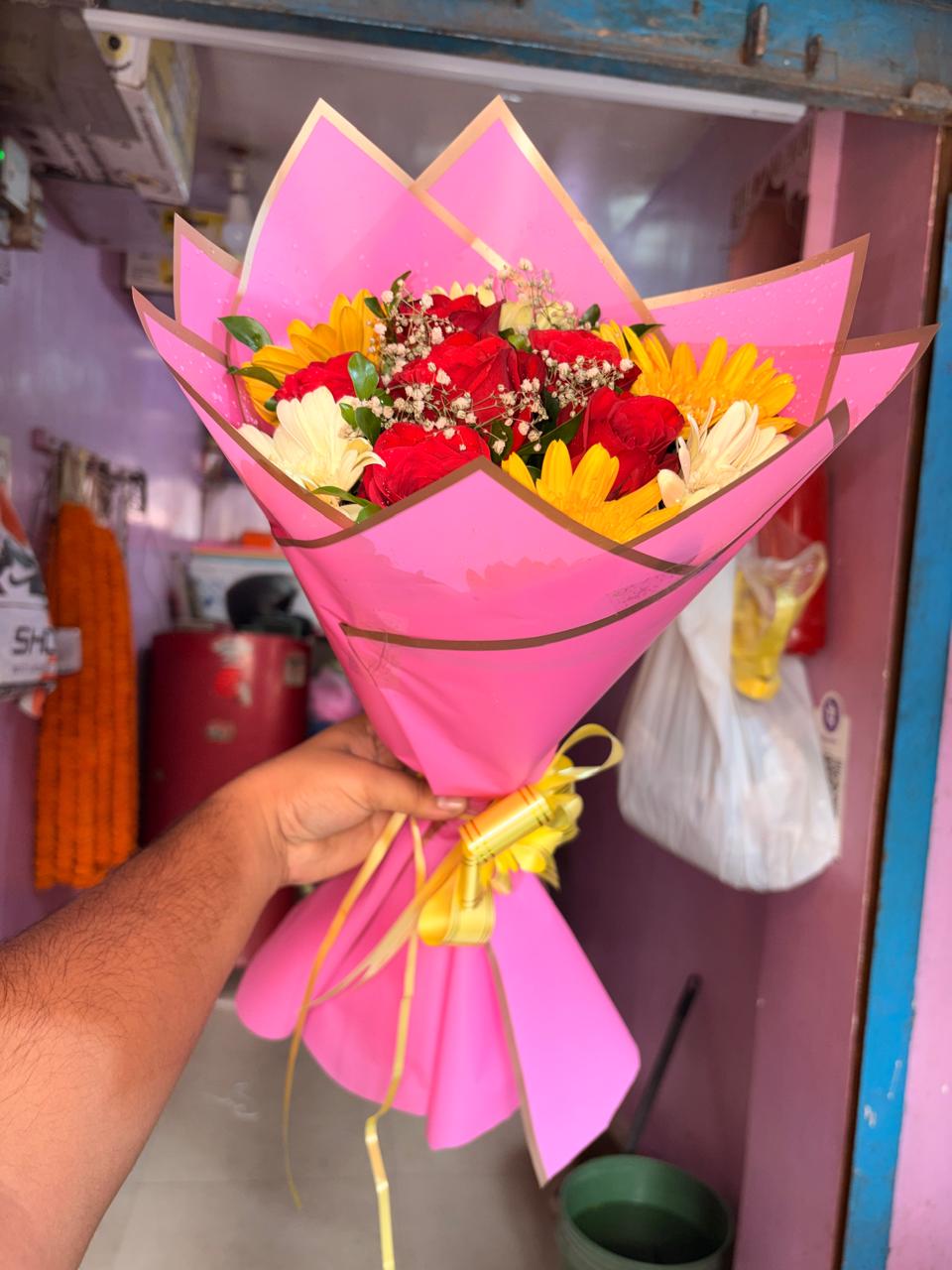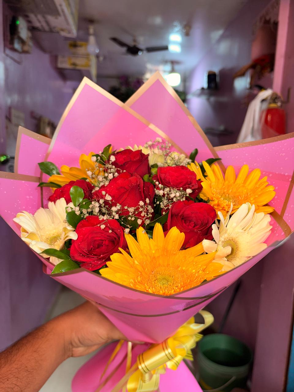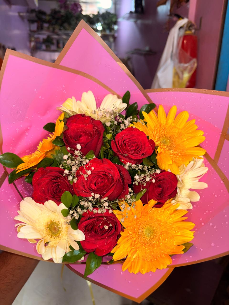 6 Mix Gerbera and 6 red roses Bouquet With pink korean Wrapping Paper