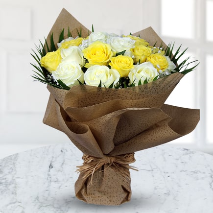 10 White And 10 Yellow Roses With Brown Wrapping Paper And Golden Halo Bouquet