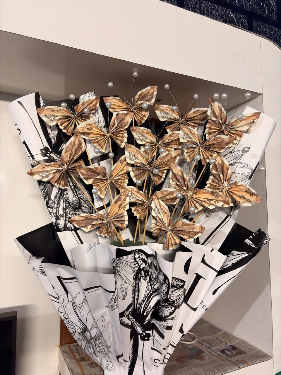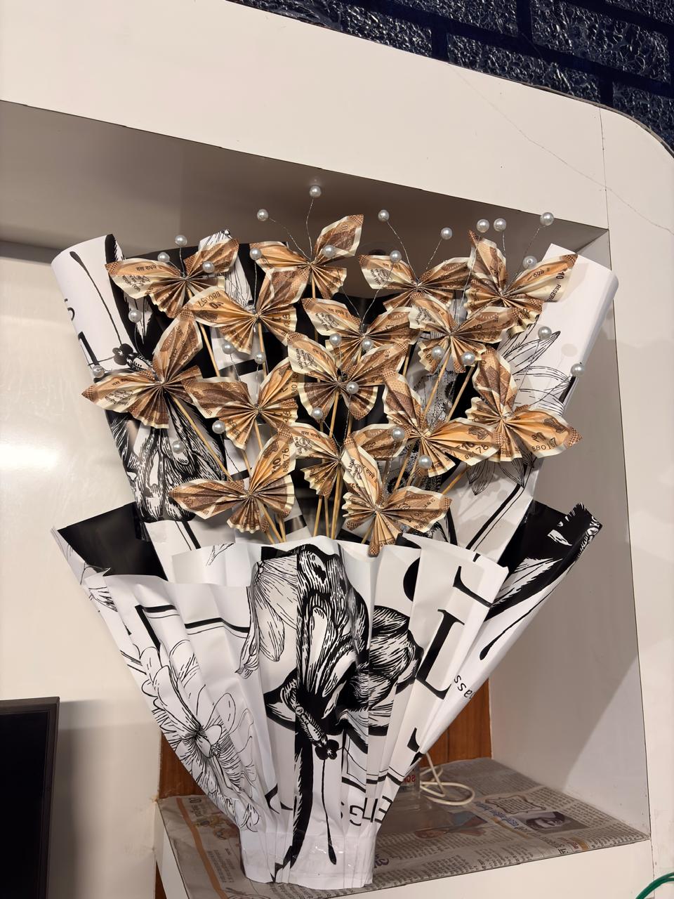 Make every celebration unforgettable with our beautifully handcrafted Currency Flower Bouquet, designed with elegance and creativity. This unique bouquet features 30 pieces of ₹10 notes, carefully folded into stunning butterfly-style flowers, giving it a luxurious and eye-catching look.