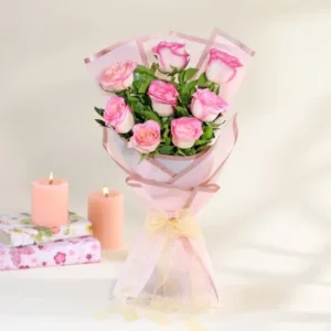 An elegant bouquet of soft pink roses wrapped in delicate pastel paper, tied with a sheer ribbon — perfect for adding a gentle touch of romance and joy.