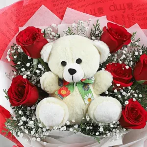 Ideal for anniversaries, Valentine’s Day, birthdays—you name it—this gift speaks the language of affection. The bold red roses symbolize deep devotion; the plush bear embodies gentle comfort. Wrapped in coordinating ribbon, the Ruby Rose Cuddle Combo isn’t just a bouquet; it’s an experience. Elegant enough to impress, yet sweet enough to melt hearts—this combo is designed to leave an impression long after the flowers fade. Give the gift that says, “I care, I remember, I adore you.”