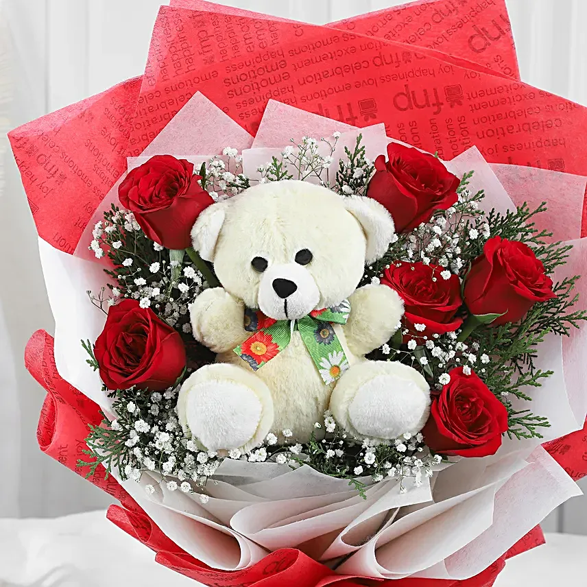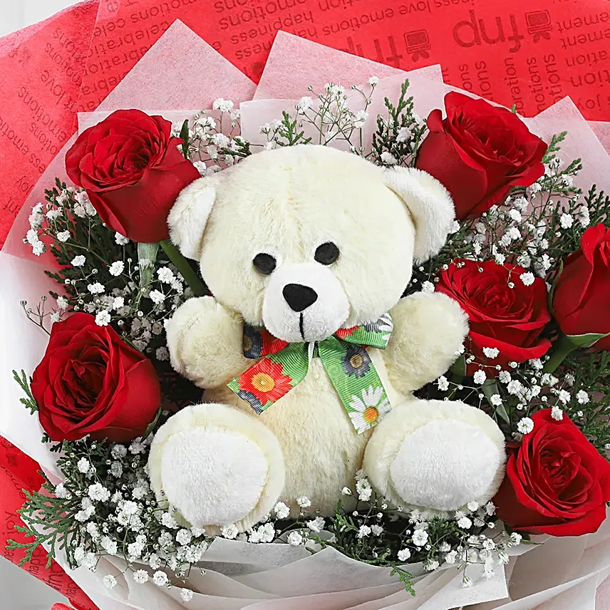 6 Red Roses & 1 Teddy Bear With Red And White Wrapping Paper